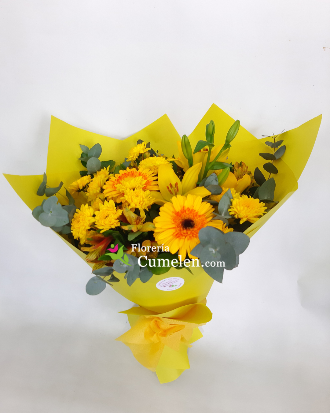 Descripcion : Ramo de flores amarillas 50x 50cm aprox. ⚠️ Las variedades de flores amarillas están sujetas a disponibilidad para este mes de primavera.